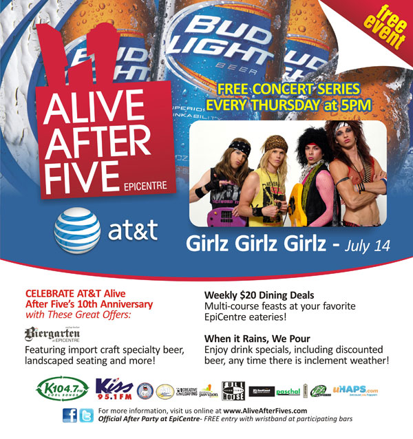 Alive After Five is how Charlotte kick-starts the weekend in style! As the city’s largest weekly happy hour and free entertainment celebration, Alive After Five provides a destination for friends and co-workers to gather and unwind, while enjoying great live music, tasty beverages, the Vineyards, featuring a variety of local and specialty wines – all in a fun, casual environment. With its prominent location at EpiCentre, close to other great restaurants, bars and shopping, Alive After Five is the launching pad for Charlotte’s nightlife and entertainment. The first four Alive After Fives are at The Wachovia Plaza (month of April). The remainder will be held at the Epicentre.