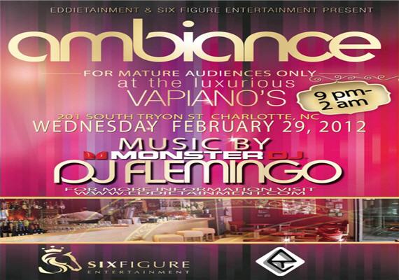 • Eddietainment and Six Figure Entertainment Present Ambiance @ Vapiano Restaurant. Eddietainment and Six Figure Entertainment team up again to kick off CI week for all our “Grown Folks”. This is the perfect event for adults who want to hear great music, dance, mingle, and feast on delectable food. Enjoy the sensational sounds of Monster DJ Flemingo at the all new posh Vapiano restaurant in Uptown Charlotte. Wednesday, February 29, 2012. Time: 9pm | Cost: Advanced Tix Available Online