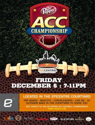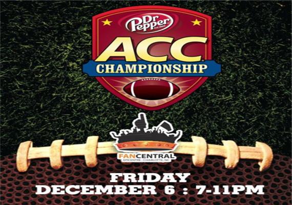 EPICENTRE welcomes the ACC Football Championship fans with a pep rally harboring a street festival atmosphere, featuring a DJ, live performances by the ACC mascots, and information about Charlotte. The team pep bands, cheerleaders and mascots will be performing as well.