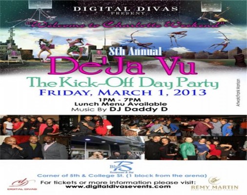 8th Annual Deja Vu Kick Off Day Party. Digital Divas has hosted this day party each year since the CIAA Tournament came to Charlotte. Music by DJ Daddy D. 1-7 p.m. $15 and up.