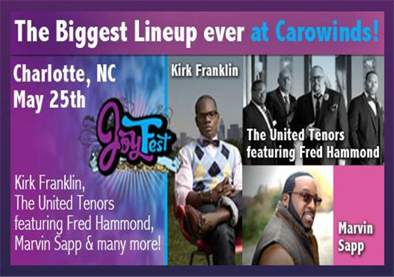 JoyFest, one of the country’s largest gospel festivals returns to Charlotte! Saturday, May 25, 2013. Featuring: Kirk Franklin, Fred Hammond, Marvin Sapp, Lecrae, Bone Hampton, The United Tenors, & more!