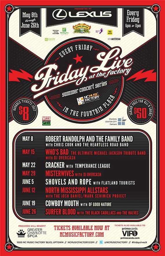 Friday LIVE is brought to you by Lexus, Sierra Nevada, Charlotte Center City Partners, Yellow Cab CLT, Barefoot Wines and Holiday Inn Center City! Proceeds from Friday LIVE! will benefit the Greater Charlotte SPCA.