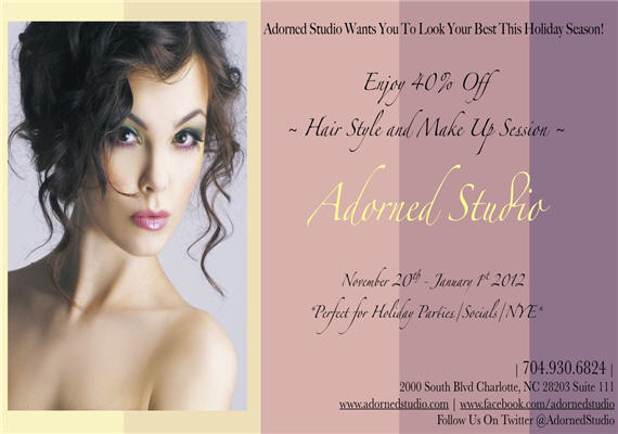 Adorned Studio wants you to look your best this holiday season so enjoy *40% off select hair and makeup sessions. Perfect for upcoming holiday events and New Year’s Eve. Offer valid Nov 20th thru Jan 1st.