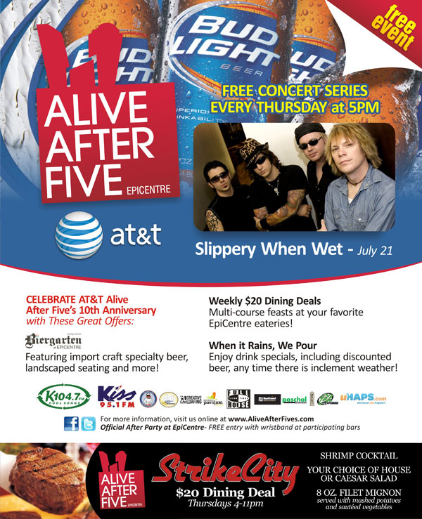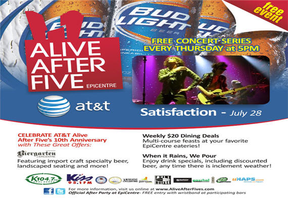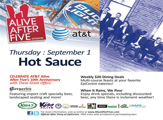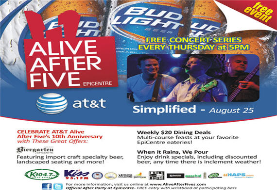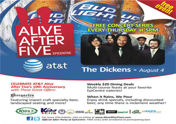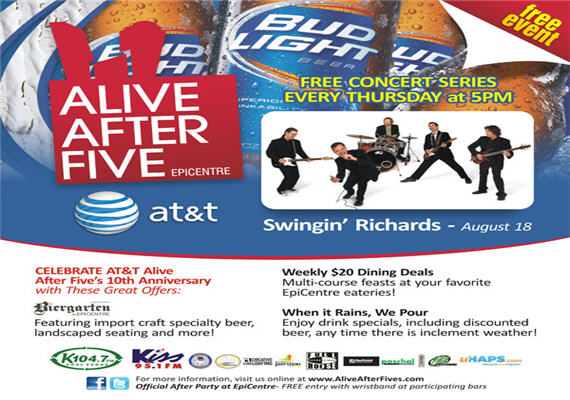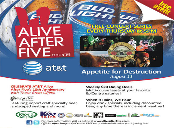 Alive After Five is how the city kick-starts the weekend in style! As the largest weekly happy hour and free entertainment celebration, Alive After Five provides a destination for friends and co-workers to gather and unwind, while enjoying great live music, tasty beverages and a fun, casual atmosphere.
