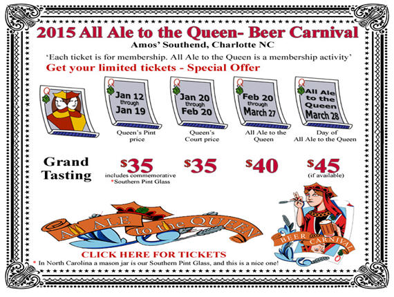 The 2nd Annual All Ale to the Queen – Beer Carnival presented by Superfly Fabulous Events, will be the ‘Official Closer of the Charlotte Craft Beer Week’ in 2015. All Ale to the Queen – Beer Carnival will be held on March 28, 2015 at Amos’ Southend in Charlotte.