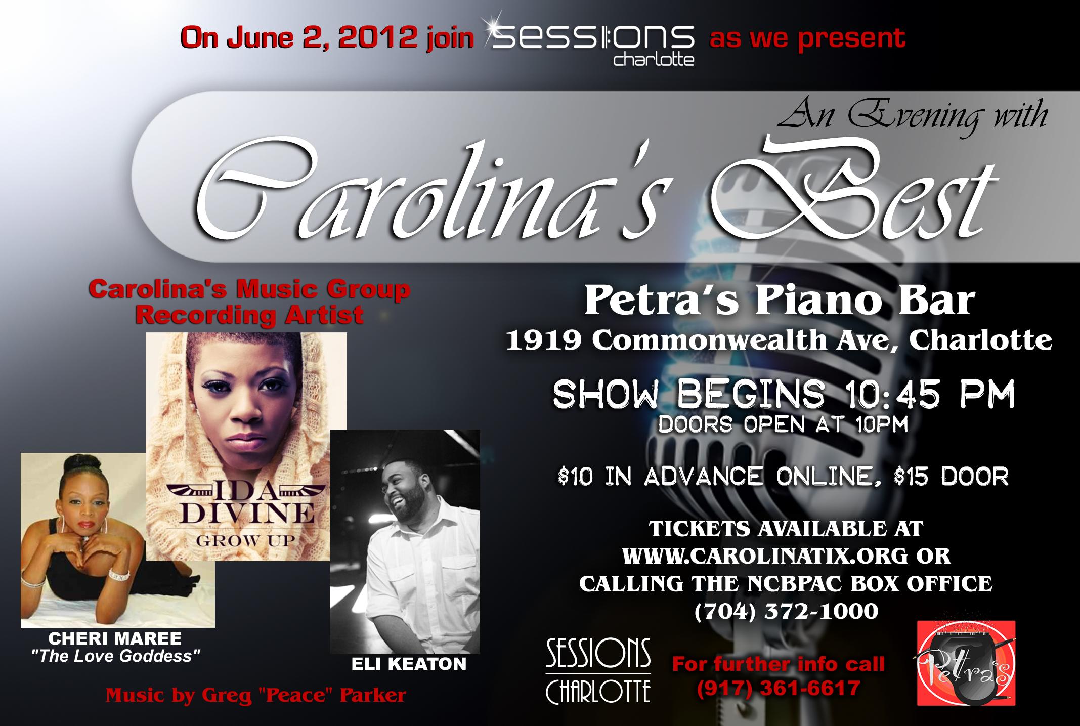 SESSIONS Charlotte, in tandem with Petra’s, presents the series premiere of “An Evening with Carolina’s Best”, showcasing the best talent Carolina has to offer across various genres of American music. On June 2, we bring to Petra’s stage three dynamic vocalists destined for success due to their commitment and passion towards their craft: The bold, classy & powerful IDA DIVINE, talented singer/songwriter ELI KEATON & “The Love Goddess” CHERI MAREE. Get your tickets now!!