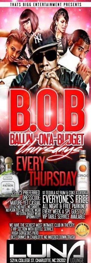 B.O.B is doing it again last week 220+ GROWN FOLK NO KID the first night (AS YOU CAN SEE IN PIC’s. wow wow wow it was crazy!! this week we TURNIN the heat up thats bigg ent is buy everyone the new Crown Royal shots from 11-12 come see what every ones been talking about!!!!!! drink are only $1 $2$3 all night!!!! BEST DJ ON THURSDAY NIGHT HANDS DOWN!!! DJ BADALA B WE UPTOWN UPTOWN UPTOWN BABY!!!!521 COLLEGE ST.!Luna lounge will be off the hook. THIS THURSDAY AND EVERY THURSDAY DOORS OPEN AT 10PM FREE FREE FOR BIRTHDAYS PARTYS OR BOTTLE SERVICE CALL 704-890-4563