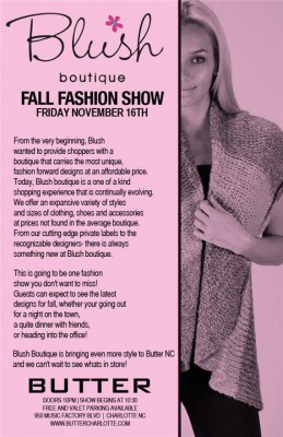 Fall into Fashion with Blush Boutique at Butter NC. See the styles of the upscale crew in Charlotte from the fashionable Blush Boutique. Fashion show, Models, and champagne make for an amazing evening! Come check out what Blush is all about!