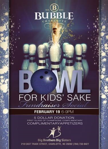Join us on February 19th from 6-9 pm at Bubble Charlotte, a premiere nightclub in the city, for the Bowl For Kids’ Sake fundraiser social! For just a small $5 donation at the door, you will not only be helping the children of Big Brothers Big Sisters, but you will be able to experience a wonderful evening filled with spirits, food, and friends!