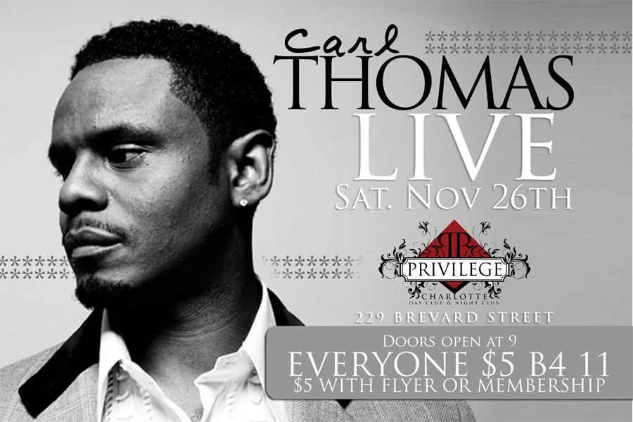 ***THE R&B SINGER CARL THOMAS*** LIVE AT PRIVILEGE NIGHTCLUB. ***EVERYONE $5 TILL 11PM** **$5 W/ FLYER OR MEMBERSHIP** DRESS CODE STRICTLY ENFORCED, NO TIMS, OR ATHLETIC WEAR. DOORS OPEN @ 9PM **21 TO ENTER, 25 PREFERRED** BOOK YOUR VIP TABLE NOW CONTACT 704-890-7436. |