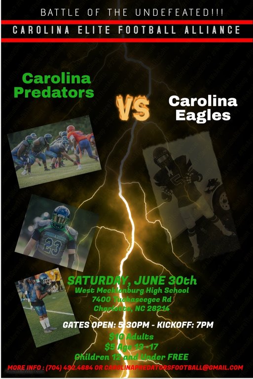 This will be the BATTLE OF THE UNDEFEATED!!  Two teams, who lately, have developed a rivalry.  This game is going to be a NAIL-BITER!!  If you miss football and want to see a GREAT football game, come out this Saturday June 30th at 7pm.  This will be the game of the season.