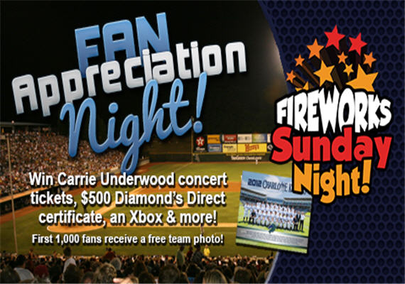 Come out to Knights Stadium Sunday night for fireworks and Fan Appreciation Night! There will be fan giveaways and the chance to win several prizes including Carrie Underwood concert tickes, tickets to baseball’s fall classic, and many more prizes!