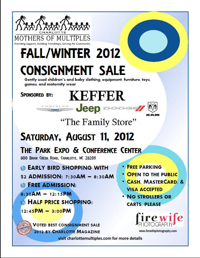Mark your calendars!  Charlotte Mothers of Multiples Fall/Winter Consignment Sale is Saturday, August 11th, 2012!