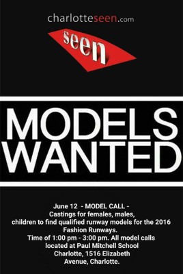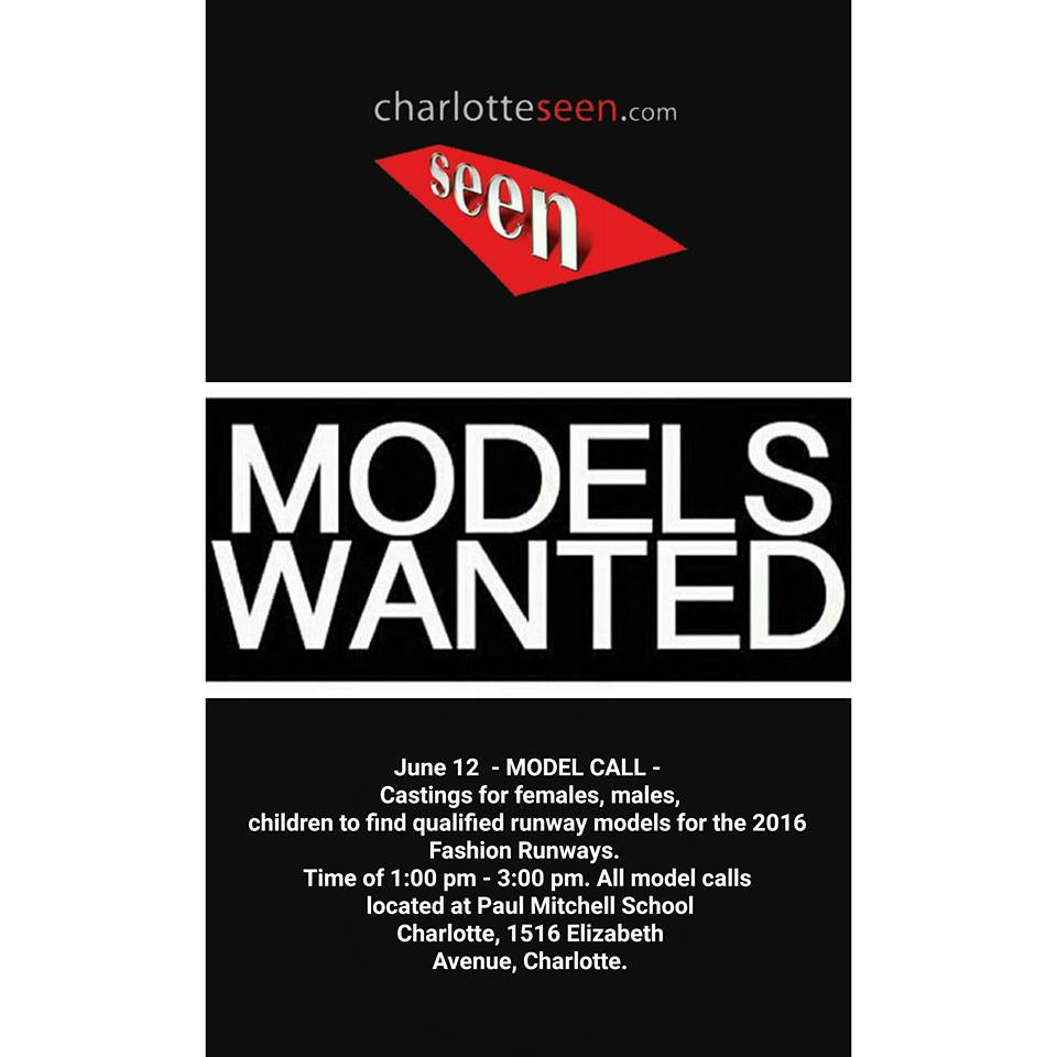 June 12, 2016 – MODEL CALLS – Castings for females, males, children to find qualified runway models for the 2016 Fashion Runways. Time of 1:00 pm – 3:00 pm. All model calls located at Paul Mitchell School Charlotte, 1516 Elizabeth Avenue, Charlotte