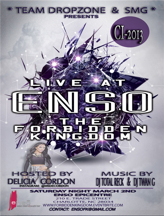 SMG & Team Dropzone,  present “LIVE @ENSO” “THE FORBIDDEN KINGDOM” CIAA-WEEKEND 2013 In Charlotte, NC….Hosted by the Lovely Delicia Cordon..Soundtrack by DJ Twan-G & DJ Total Reck