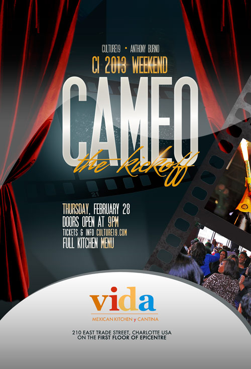 This event is for the experienced partygoer who is promptly ready to create memorable experiences! You only live once, remember that saying? Kickoff your CI 2013 entertainment weekend by making a Cameo at Vida positioned within the Epicentre. The space’s alluring decor features floor to ceiling windows exhibiting the best view of Uptown Charlotte, bar none. DJ Paradime will keep the sellout crowd moving by playing the best in Hip Hop & R&B . The full kitchen menu will be available.