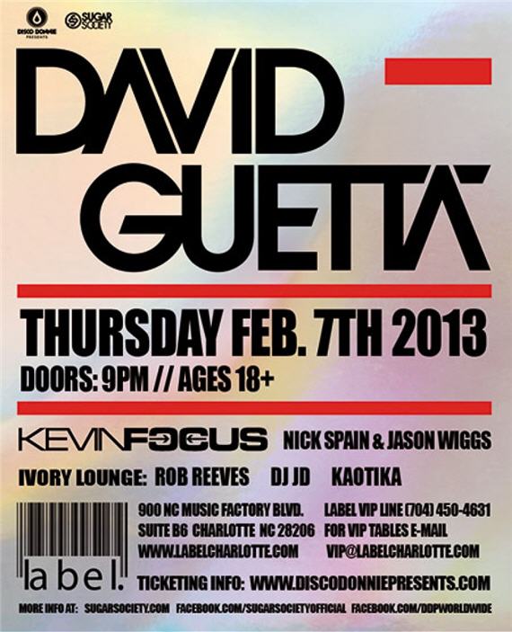 Disco Donnie, Sugar Society, & Label Charlotte Presents David Guetta LIVE @ Label – Thursday, February 7, 2013!!!