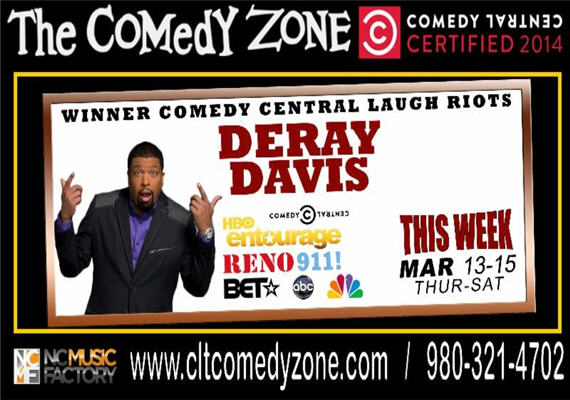 Comedian and Actor DeRay Davis brings his hilarious standup to Charlotte’s Comedy Zone March 13 – 15, 2014.