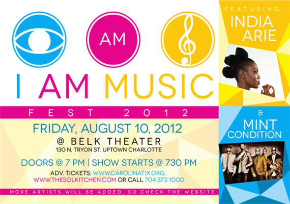 After doing concerts in the Charlotte area for 9+ years, The Sol Kitchen has decided to do their very first “Music Festival”. It’s entitled “I Am Music Fest 2012”. This year’s festival will be held at Belk Theater and headlining will be Grammy Award Winning Singer/Songwriter India Arie. Other artists will be named in the upcoming weeks. India Arie hasn’t been to Charlotte in 3 years and we wanted someone who appeals to everyone to headline the first festival. Our goal is to introduce new & upcoming artists as well as artists who have been out of the limelight for a while. Being that this is the first one, we will bring 3 to 4 artists and rest assured, you will enjoy the artists that we are bringing.
