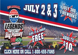 The biggest grassroots racing event in the country, the Legends Big Money 100, returns to Charlotte for two days – July 2 & 3, 2012. Featuring two days of racing, a pre-race concert, autograph session, & a Fourth of July fireworks extravaganza.