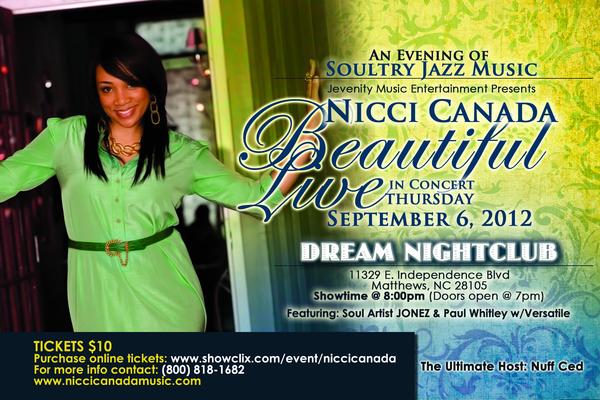 The DNC Topper!! Experience the live, melodic jazzy sounds of Nicci Canada performing from her debut album “Twenty Twelve’. Also featuring that evening are Soul Artist Jonez, Paul Whitley w/Versatile and Blues Singer Chris Cook. Great Atmosphere, Drinks and after party. You don’t want to miss this!!!