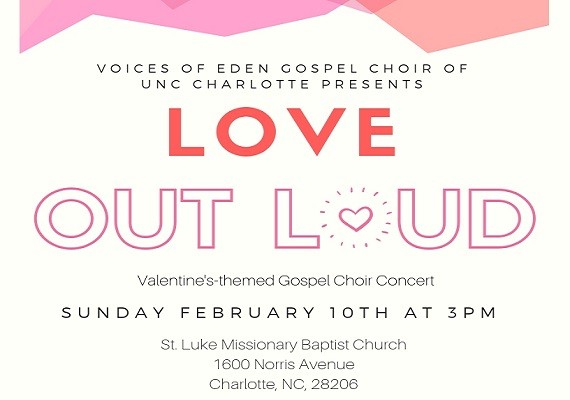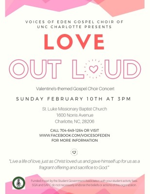 Come join the Voices of Eden Gospel Choir at UNC Charlotte in our annual gospel concert in honor of St. Valentine’s Day. The concert begins at 3:00 PM (sharp) on Sunday, February 10th at St. Luke Missionary Baptist Church (1600 Norris Ave), and features VOE along with other special guests. Admission and parking are free and open to the public. As you show and give love to others this Valentine’s season, join us as we openly confess our love for the Lord!