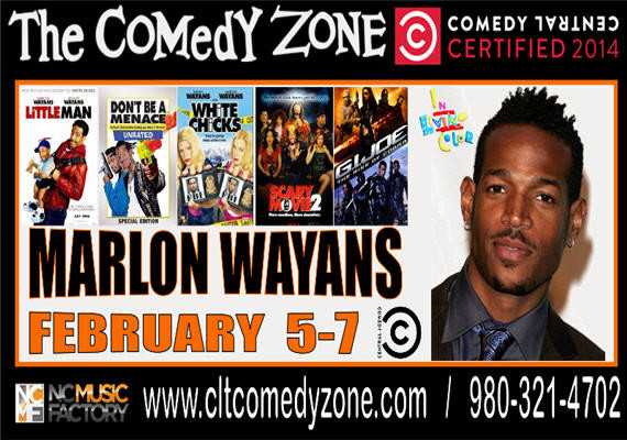 Comedian/Actor Marlon Wayans brings his hilarious stand up to Charlotte’s Comedy Zone – Thursday, Feb 5th – Saturday, Feb 7th, 2015.