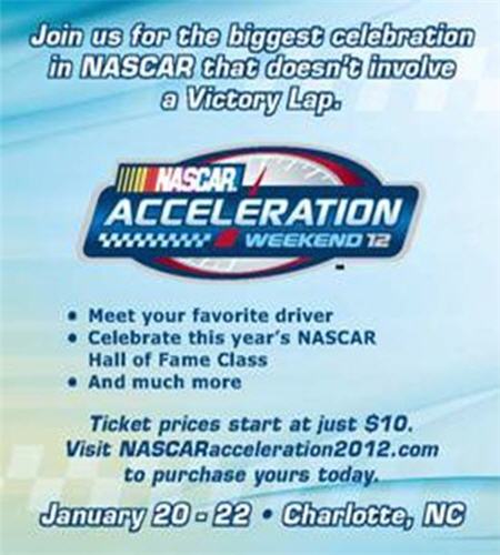NASCAR fans can get a jump start on the 2012 season at NASCAR Acceleration Weekend Jan. 20-22 in Charlotte, N.C. The weekend’s activities commence with the 2012 NASCAR Hall of Fame Induction Ceremony, followed by NASCAR Preview 2012 Presented by Sprint, where fans can interact with the sport’s legends and current stars in person, get autographs and catch a sneak peek at the upcoming season. Fans can go to www.NASCARacceleration2012.com or call 1-800-745-3000 for NASCAR Hall of Fame / NASCAR Preview 2012 ticket packages starting at $20. Children under five-years old are FREE.