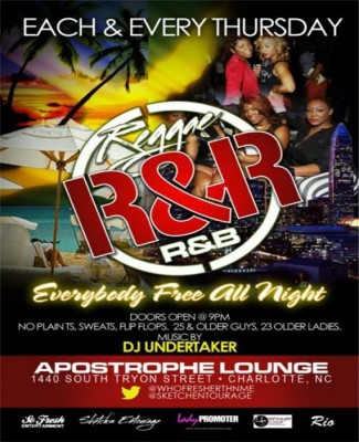 REGGAE & R&B EACH AND EVERY THURSDAY AT APOSTROPHE’ LOUNGE EVERYBODY FREE ALL NIGHT! DOORS OPEN AT 9PM MUSIC BY DJ UNDERTAKER LADIES 23+ FELLAS 25+ DRESS CODE: UPTOWN FLY NO PLAIN TEEs, SWEATS, FLIP FLOPS, OR ATHLETIC WEAR