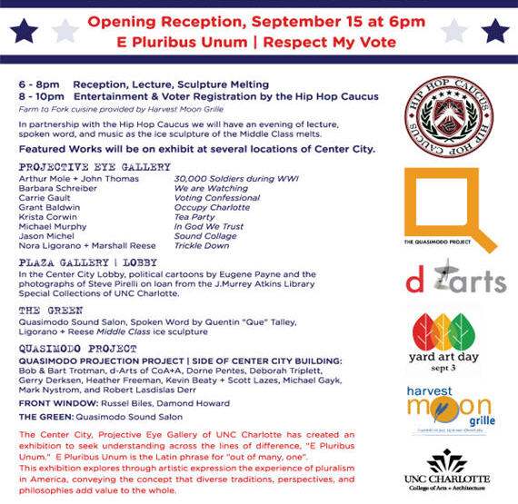 E Pluribus Unum, Latin for “out of many, one,” is the title of an exciting new exhibit at UNC Charlotte Center City based on diverse traditions, different views, philosophies, and strategies. UNC Charlotte has partnered with the Hip Hop Caucus’ Respect My Vote! initiative to host an interactive Opening Reception on Saturday, September 15 at 6 p.m. at the beautiful UNC Charlotte Center City building, free and open to the public. Performances by Mike from Day 26, Bettie Grind, and Mr. 704 will ignite the evening.
