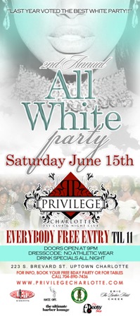 Saturday, June 15th, Privilege will be hosting their 2nd Annual All White Party! Everyone,free entry until 11! Doors open at 9…No Athletic Wear Allowed….223 S. Brevard St.