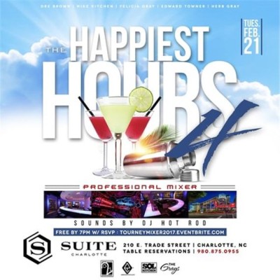 On Tuesday, February 21st, Dre Brown, Edward Towner, Mike Kitchen, Herb & Felicia Gray invite you to kick-off Tournament Week 2017 with another evening of sophistication for the highly anticipated after-work trend “The Happiest Hours 4: Professional Mixer” at Suite (210 E. Trade Street, Charlotte, NC).