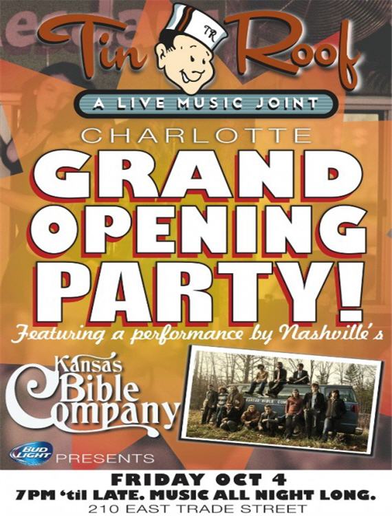 Grand Opening @ Charlotte’s Tin Roof! Join us Friday, October 4th for great music, food giveaways, prizes and lots of fun. Plus, live music by Nashville-based band Kansas Bible Company.