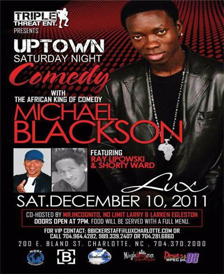 Triple Threat Ent. Presents Uptown Comedy Night with the African King of Comedy Michael Blackson and special guests Ray Lipowski and Shorty Ward. Saturday, December 10, 2011 @ LUX.