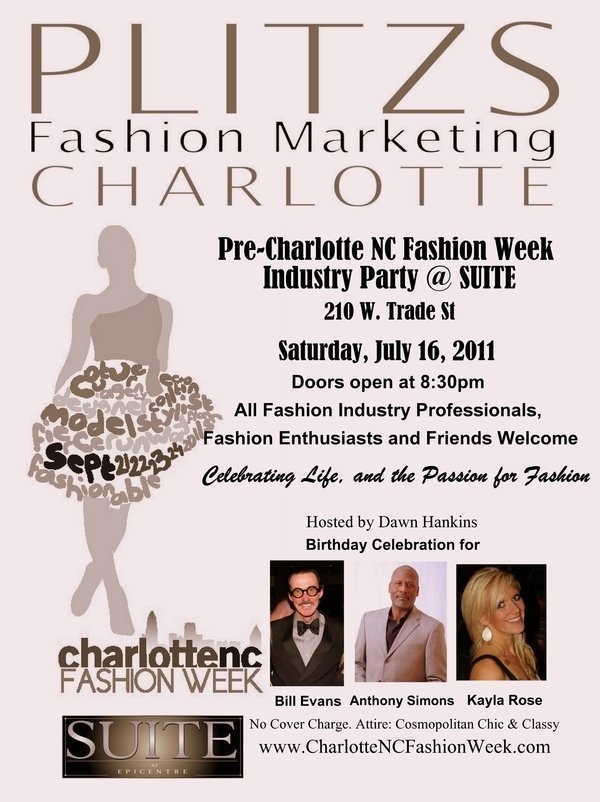 All fashion industry professionals, fashion enthusiasts and friends are welcomed to the Pre Charlotte, NC fashion week industry party Saturday July 16, 2011 at SUITE.