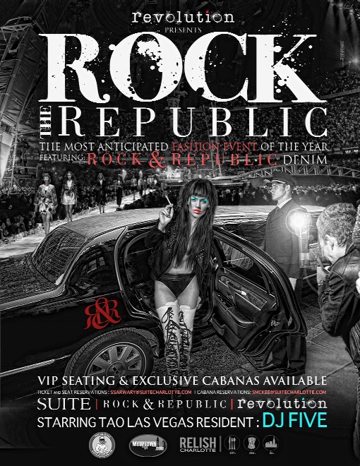 Revolution brings the world’s most popular denim brand Rock & Republic and their unique, hip, and top of the line style to Charlotte, NC for this year’s most anticipated fashion event. As style and fashion mix with 80’s rock along with a sexy modern twist, the crowd will enjoy an upbeat vibe before, during, and after the show. From the moment you step foot onto the rooftop Pavilion of the Epicentre you will begin moving to the beats from, TAO and LAVO resident in Las Vegas, DJ FIVE.